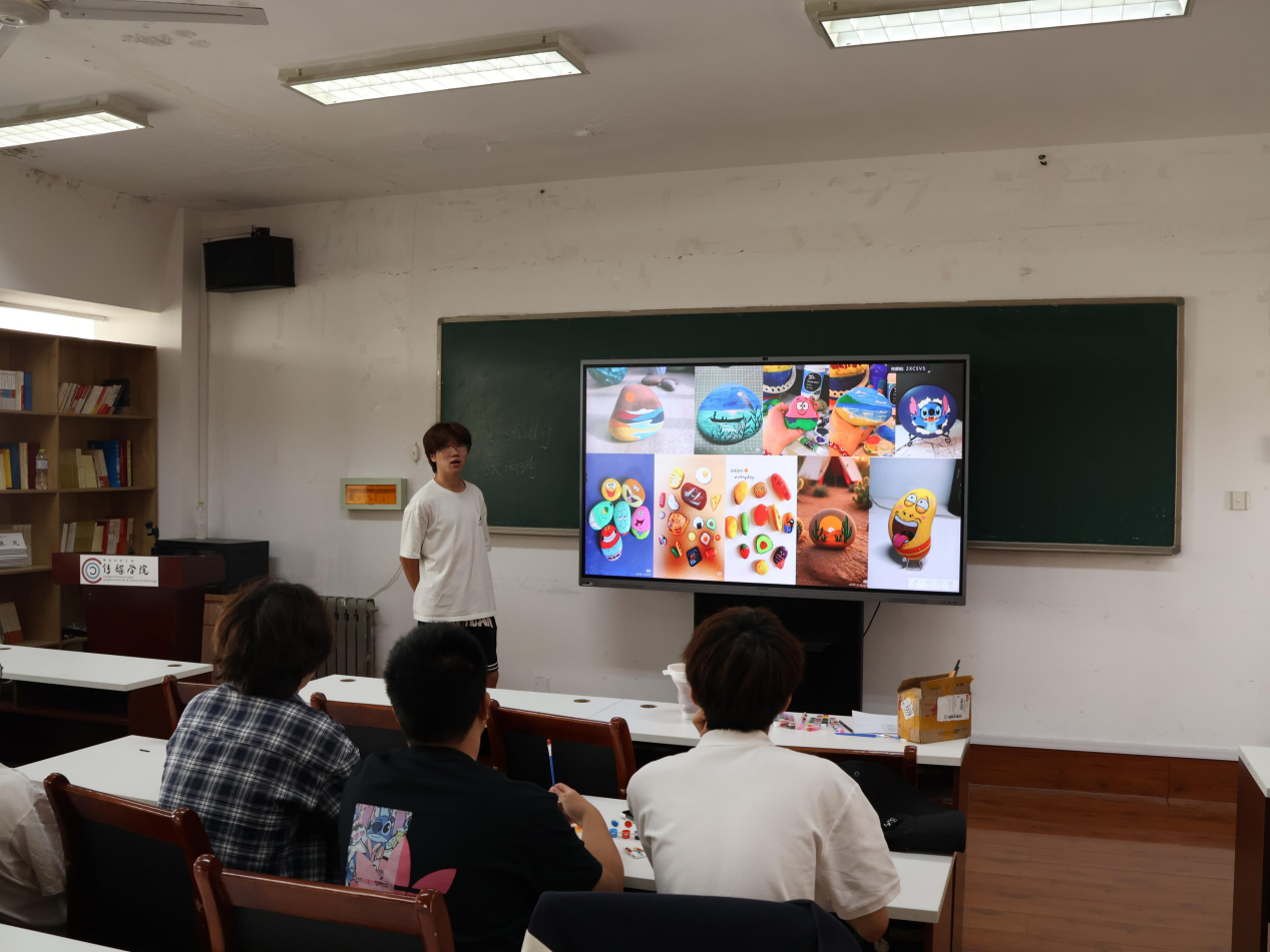 310会议室迎来“石间绘心,艺语疗愈”艺术疗愈体验活动。在舒缓的音乐中,同学们拿起画笔,在一个个鹅卵石上描绘出各式各样的图案,并进行交流分享。这不仅为同学们提供了一个独特的自我表达渠道,更完成了一次深刻的内在探索与情感联结。